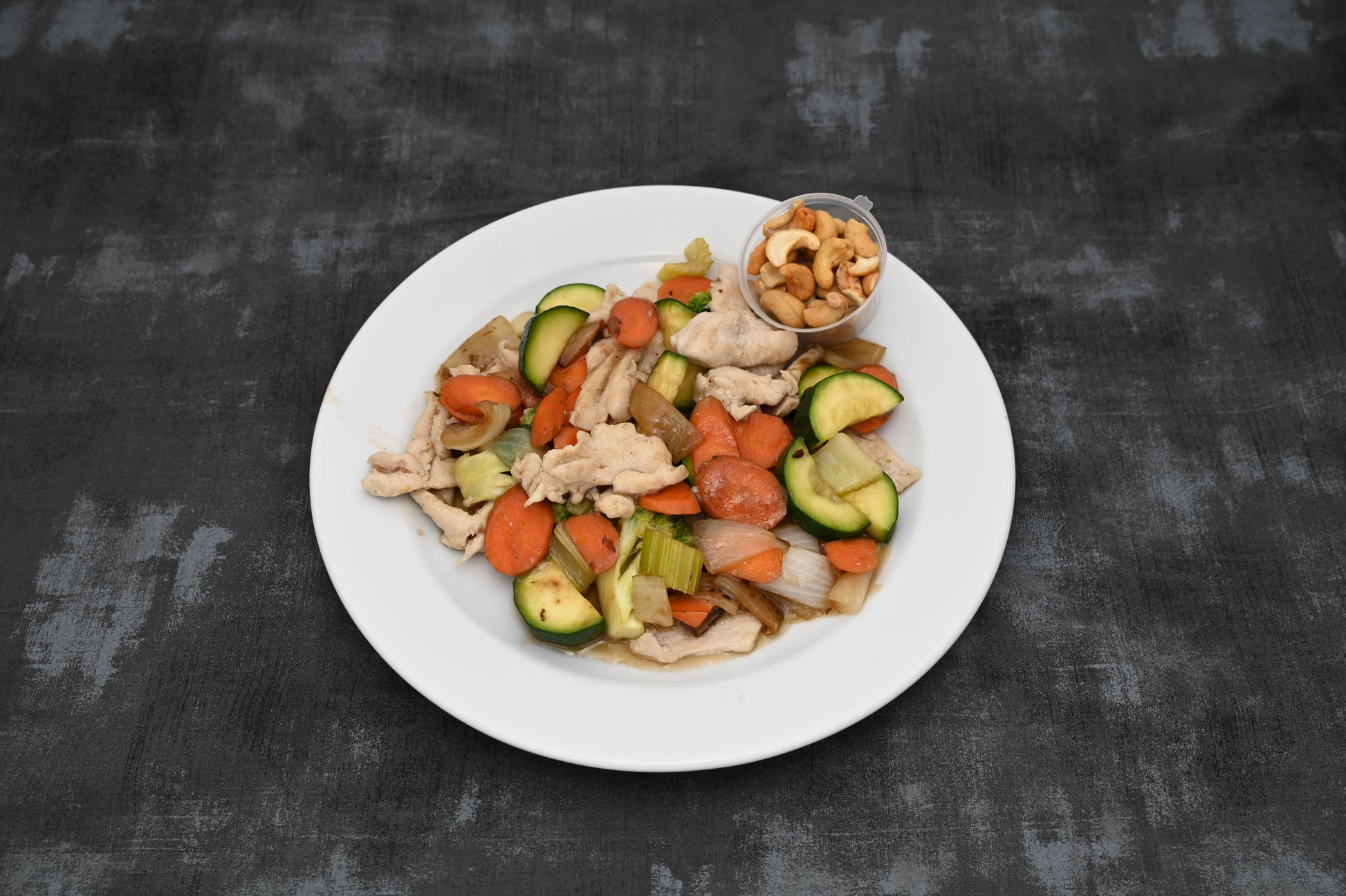 This is a stir fry chicken & vegetables with oyster sauce & cashew nuts, and served with rice.