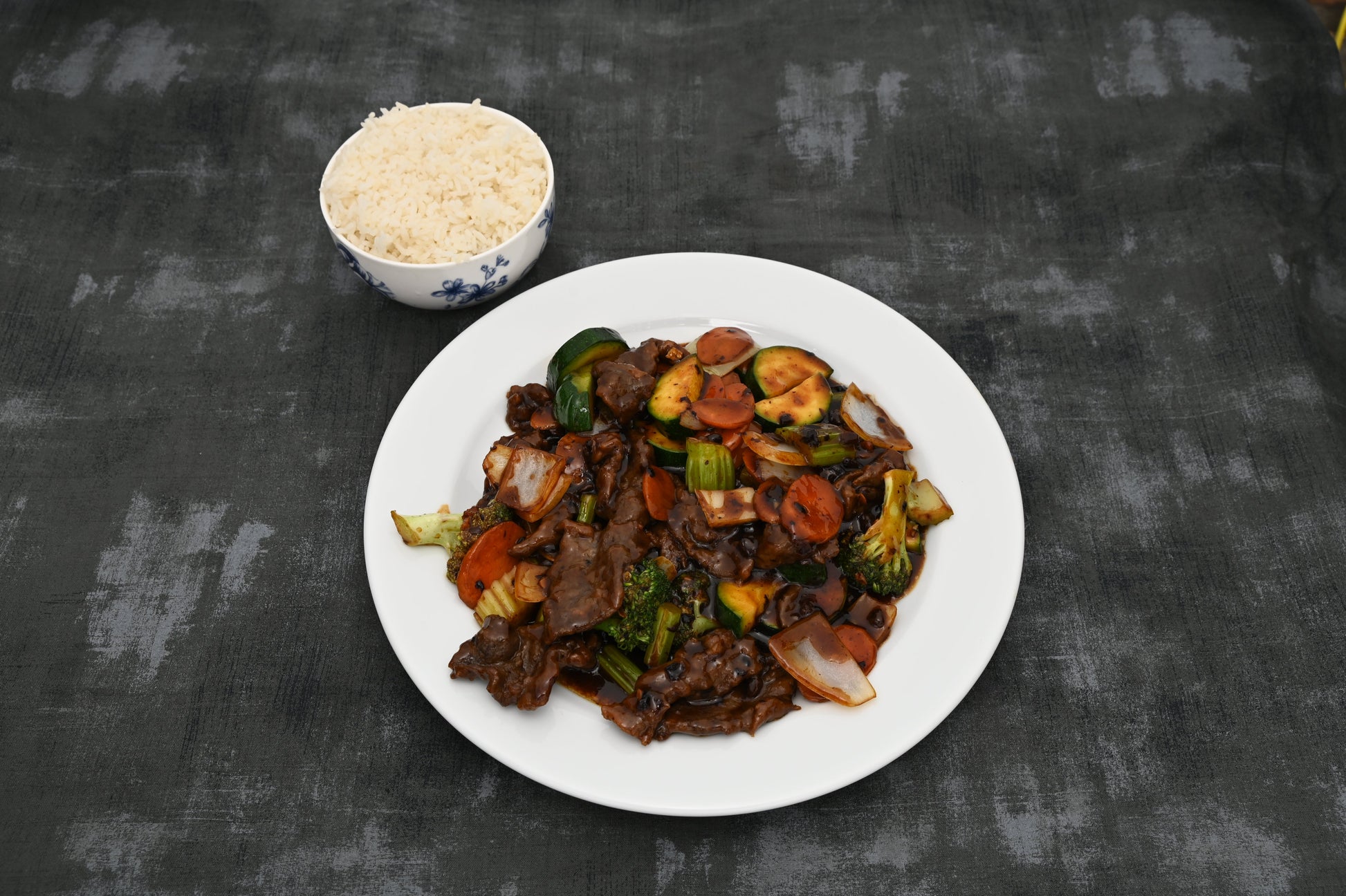 This is a stir fry beef & vegetables with mongolian sauce, and served with rice.